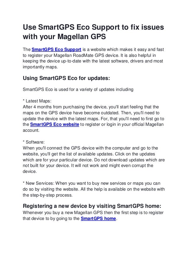 Www smartgpseco com. To install magellan gps updates users must download and install the content manager software on the magellan website and then launch the program check for updates and select what updates to install. Magellan gps map updates are available for free and for purchase on the magellan website. Tutorial on how to register your magellan gps device using content manager.